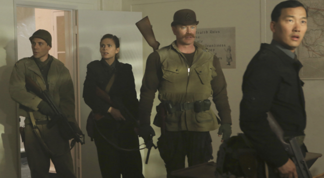 The moment when the members of the first Captain America movie unite is a great one as it recalls those action sequences they took part in during that movie and gets to rekindle their friendship on the small screen. Not to mention the appearance of another Whedon alumni from ‘Buffy…’ , Leonard Roberts as ‘Happy’ Sam Sawyer, quite possibly Trip’s (from ‘Agents Of S.H.I.E.L.D.’) Howling Commando ancestor? The dynamic between Dum Dum Dugan and Carter is also great, as they even make references to the Captain himself in an emotional moment. ‘The Iron Ceiling’ is full of these great little character development moments, especially for Chad Michael Murray ‘s Jack, who confides in Carter after we find out that he’s not the badass soldier everyone thought he was. It’s a bitter sweet moment for me as the actor starts doing that lip pursing expression he does when he tries to… emote. However, it does humanize the otherwise male chauvinistic character and changes the dynamic in the show of him being more an ally to Carter than a rival. Although this dynamic may soon change given the previews for next week’s episode.
