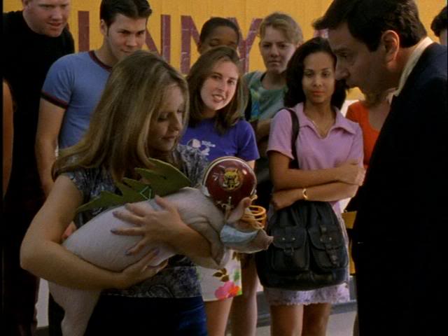 As I mentioned already this episode also sees us saying goodbye to another member of the Sunnydale High Faculty, as Principle Flutie gets possibly one of the cooler deaths on the show as he’s eaten by his own students. Not a great loss it has to be said as he was always one of the weaker and frequently more irritating characters on the show and kind of deserved it for having a framed picture of himself on his desk! Seriously what sort of person has a framed picture of themselves, let alone a standard portrait shot and not him doing something vaguely interesting which would justify such a thing. I have to also wonder how they cover for these random deaths when they high their replacement? Surely admitting that their predecessor was eaten by his own students is hardly going to have folks leaping to take up the role. However this episode is one of the few occasions were a strange death like this is actually covered up, with Flutie’s death being linked to wild dogs. Xander is notably absent from this scene, which is probably for the best as god knows what sort of damage that would have done to his psyche, though the writers do still have him joining the pack when they eat the school mascot.
