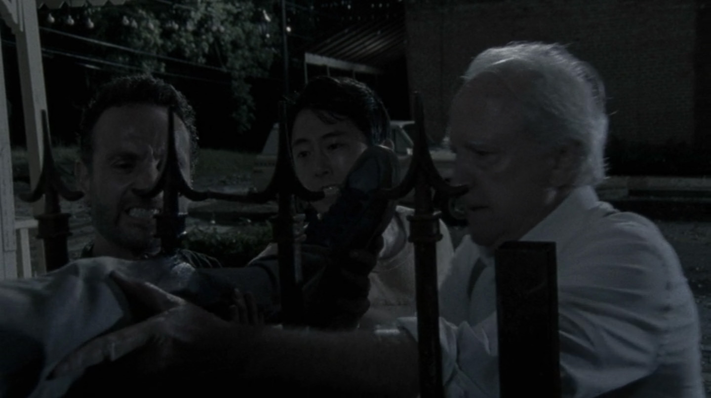 Back at the bar, Rick, Hershel and Glenn are on their way out the door when they hear others looking for the recently deceased Tony and Dave. Glenn sits in front of the door to keep it from being opened, and though Rick tries to explain the situation and keep anyone else from dying, the strangers open fire on the bar. Eventually the three make it out the back door, but all the gunfire has raised the alarm to a swarm of Walkers. The strangers finally decide to flee, but as one is jumping from a roof, his leg becomes impaled on a wrought iron fence and he gets left behind. Hershel believes they should mercy kill him to save themselves, but Rick insists they bring him along because he’s just a kid, despite the fact he just tried to kill them all.