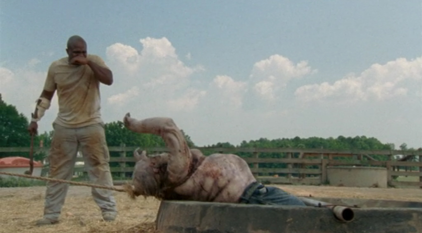 Disclaimer: I’m not including “known” characters here, so neither Shane nor Sophia, or even Randall for that matter, made the cut. With that out of the way, this season’s winner is definitely Well Walker from Episode 4 “Cherokee Rose.” I briefly mentioned it in that post, but it was a Walker that somehow became trapped in one of the Farm’s water wells. They sent Glenn down to put a rope around its middle so everyone could heave the bloated corpse up, but once it was nearly clear of the well, it became stuck and the body ripped as the lower half fell back into the well and the remainder lay on the ground flailing and growling. Even before tearing apart, looking at the Walker was like seeing some horrible creature in an old monster movie. The water and bloating certainly did the trick. It’s probably one of the more gruesome sights the Group has encountered up to that point and the first Walker that Maggie didn’t call by name, so it made a huge impact on her thinking toward the undead. Memorable and absolutely disgusting for so many reasons.