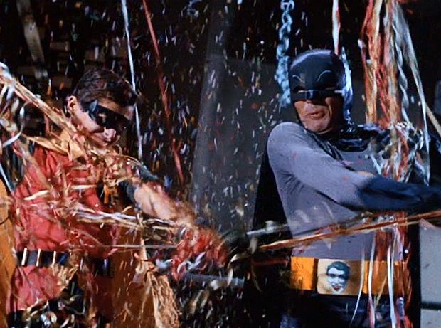 Now, after two failed attempts to catch Joker, Batman and the Boy Wonder are taking a trouncing in the press. However they must continue with their duties. They have been called upon to christen a new ship…the S.S. Gotham. However, the woman who presents Batman with the champagne bottle is the Joker’s girl, Queenie (Nancy Kovack). Just before smashing the bottle, Batman feels a headache come on and takes a pill from his belt to help. He also insists Robin take one. When smashed, the bottle releases knock out gas and the Joker’s men capture the heroes. Later, on live TV, Joker demands the deed to the S.S. Gotham or else the Dynamic Duo get their heads cut off. Luckily, our heroes aren’t really unconscious. You see, Batman noticed the cork had been tampered with and took, not asprin, but a universal drug antidote pill. Cue the final fight which, as you may have guessed, ends with the Joker back behind bars.