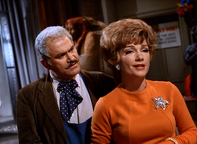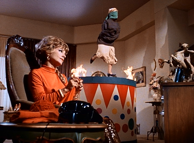 Meanwhile, in the back room of a strange occult bookstore we find Eivol Ekdol (Jack Kruschen) maker of stage illusions for magicians. Eivol is visited by one of his most prominent clients, magician Zelda the Great (Anne Baxter). Eivol’s illusions do not come cheap, $100,000 in fact, which is why Zelda has had to take to robbing banks to fund the purchase of a new illusion each year. She is wanting to purchase Eivol’s newest and greatest illusion, the inescapable doom trap. But he now believes the money she brought is counterfeit (because of the newspaper headline)…so she needs to come up with more funds. The answer lies in the newspaper: the giant Star of Samarkind emerald will be on display at a local jeweler…and it is ripe for the picking.
