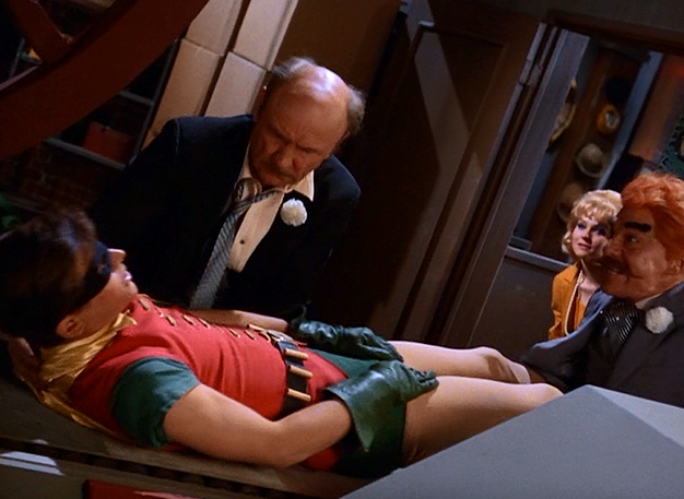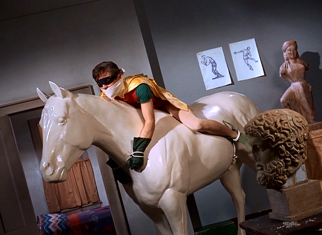As we begin, sculptor Octave Marbot is working to try and chip away the plaster covering around Batman as the Mad Hatter watches. Remember, the Hatter is after Batman’s cowl. He figures that our hero must be dead by now, so there’s no harm in freeing him. Meanwhile, Robin is gagged and tied to a statue of a horse…which is perhaps one of the most bizarrely suggestive images in the history of this show. When Marbot finally cuts away the plaster, everyone is surprised to find Batman still alive! The Mad Hatter and his men flee, trying to steal the Batmobile but failing. Later, Batman explains to Robin how he survived…he simply held his breathe.