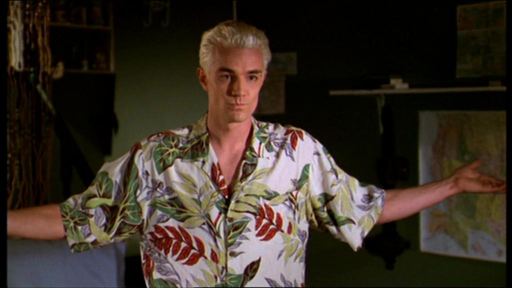 Elsewhere the Buffy-verse’s version of “The Odd Couple” that is Xander and Spike still living together in Xander’s basement where things are only continuing to get worse, especially for Spike who continues his downward spiral caused by his implanted chip which stops him attacking humans and essentially leaving him as he views it impotent. Meanwhile his trademark outfit suffers a washing malfunction when he accidentally shrinks them and leaving him with no option but to raid Xander’s wardrobe so that he spends most of the episode in a distinctly Hawaiian look which is only made the more comical with Spike looking as what I can only assume Billy Idol does on his vacation.