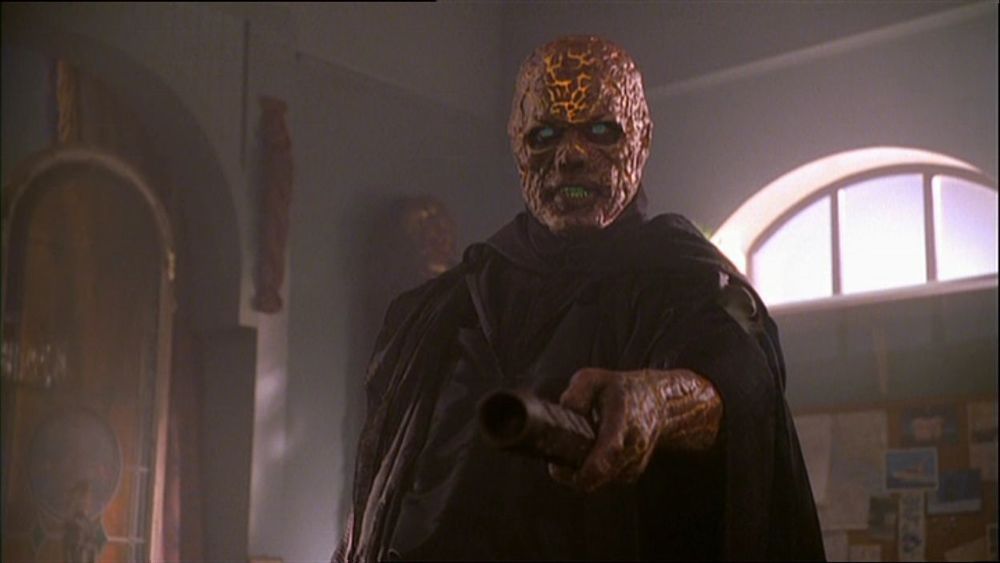 As the villain of the episode Toth has the right amount of presence with Michael Bailey Smith doing more great monster work, while certainly no stranger to heavy make up having played numerous roles on “Charmed” aswell as playing “Super Freddy” in “A Nightmare on Elm Street 5”. Here he sports an equally great make up job which somehow makes him seem luminous at times. True he might be more of a plot device, but atleast we get a fun showdown between him and Buffy which sees him mixing things up from the usual martial arts brawls as he throws in a few wrestling slams. I would however question how safe it can be to toss a sword as requested by Buffy and which I’m sure in real life wouldn’t end well.