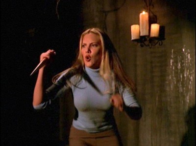 This episode could be seen to be setting the reunion of Spike and Drusilla as a major plot thread of the season as the two go on the hunt again as well as the fact that she appears to have given him a way to bypass the effects of his behaviour chip as seen with the pair feeding on a couple at the Bronze with Spike suffering no effect from his chip. It’s unclear if the fact that Drusilla breaks the girls neck before Spike feeds on her is a way to get around the effects of the chip seeing how it only stops him hurting humans though the rules on if they are dead seemingly is alittle more fuzzy. Sadly this isn’t the expected reunion that we hope it would be as Spike soon has both Drusilla and Buffy tied up with plans to stake Drusilla which he hopes will emulate Angel staking Darla and in his mind somehow prove his love for her.